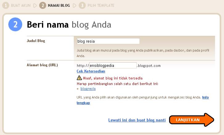 Dalam contoh saya akan ciptakan sebuah blog yang berhubungan dengan ensiklopedia. Saya memasukkan “blog resia” sebagai judul blog dan “ensiblogpedia” sebagai alamatnya. Oppss, ternyata alamat “ensiblogpedia.blogspot.com” telah digunakan orang lain. Jangan memaksa! kamu tidak dapat menggunakan alamat tersebut, lihatlah di bagian bawah Blogger merekomendasikan penamaan blog kamu. Kalau tetap tidak cocok silahkan pikirkan nama yang sesuai dengan keinginanmu sendiri.